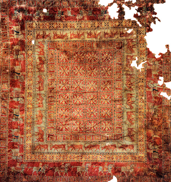 La alfombra tiene 2.500 años de antigüedad, lo cual indica que las alfombras anudadas a mano se fabrican desde hace por lo menos ese tiempo, aunque, probablemente, su antigüedad se remonta a épocas anteriores. Parece ser que son pastores nómadas asiáticos los primeros que tejen estas alfombras con lana de sus ovejas, y que las utilizan para dormir o sentarse sobre ellas para comer, rezar o charlar.