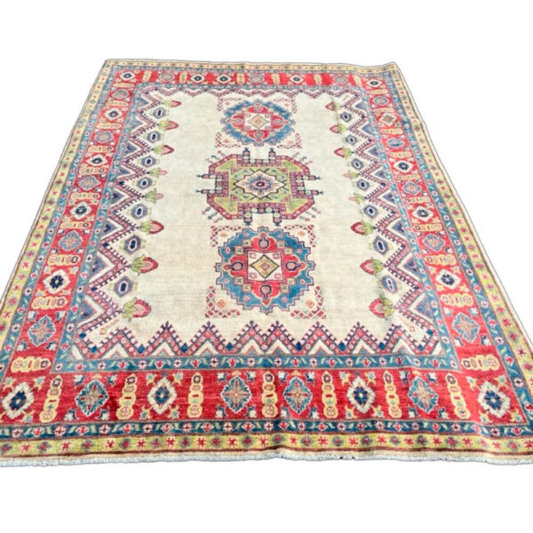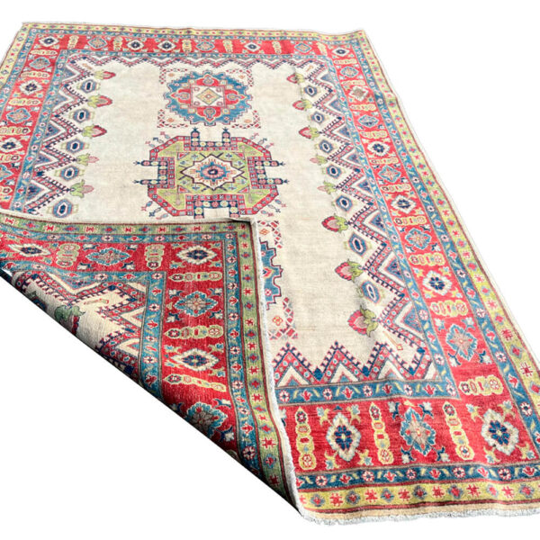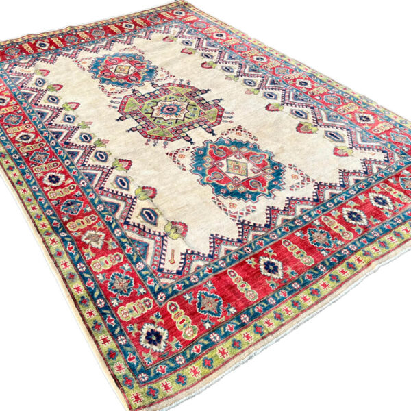 Magnífica alfombra afgana Kazak Ariana, anudada a mano, por expertos artesanos afganos, con lana de excelente calidad de oveja de raza Karakul, sobre una resistente urdimbre de algodón.