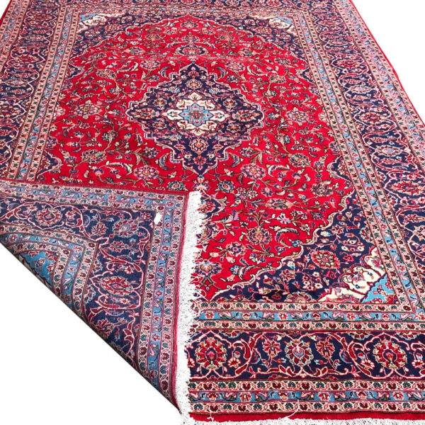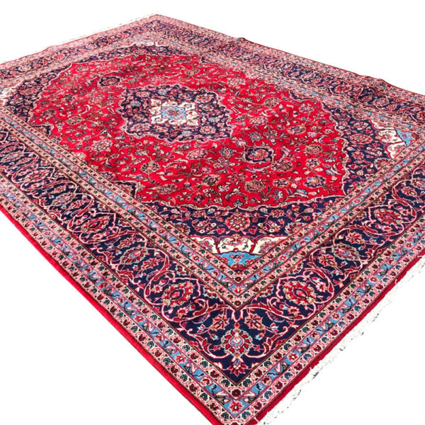Impresionante alfombra persa Kashan anudada a mano por expertos artesanos iraníes, con pura lana virgen de oveja de raza Assaf, hilada a mano, sobre urdimbre de algodón.