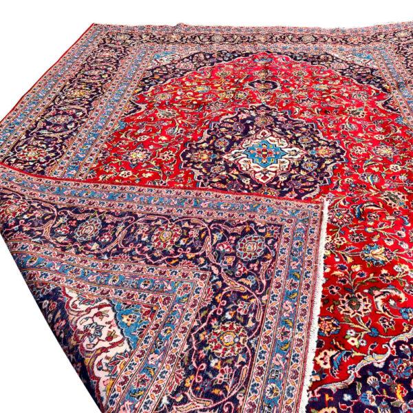 Magnífica alfombra persa Kashan anudada a mano, por expertos artesanos iraníes, con lana de excelente calidad de oveja de raza Assaf sobre una resistente urdimbre de algodón.